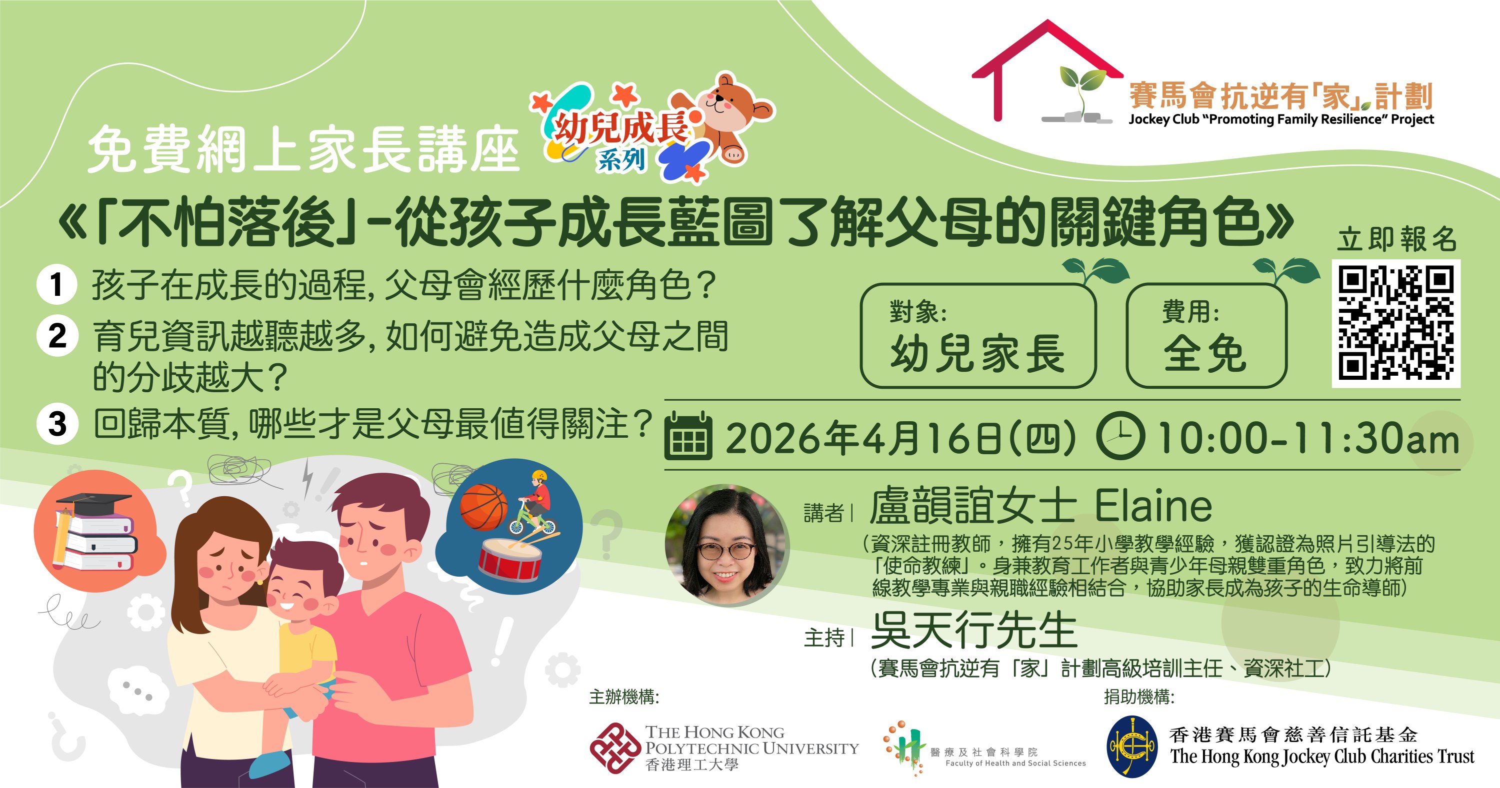 如有任何查询,可致电3400-8513或电邮至 family.resilience@polyu.edu.hk 与赛马会抗逆有「家」计划职员联络。