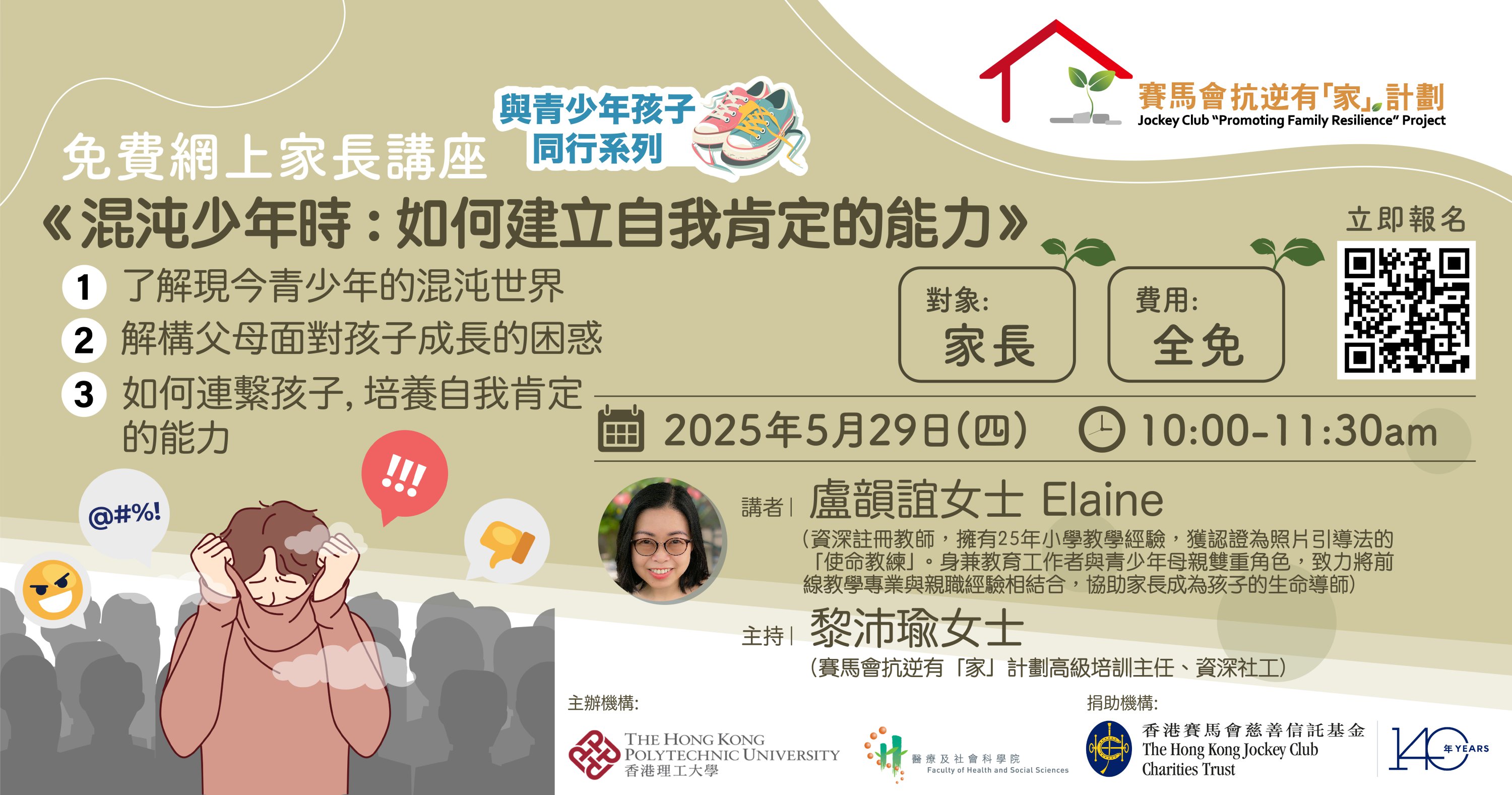 - 【免費網上家長講座】與青少年孩子同行系列《混沌少年時:如何建立自我肯定的能力》