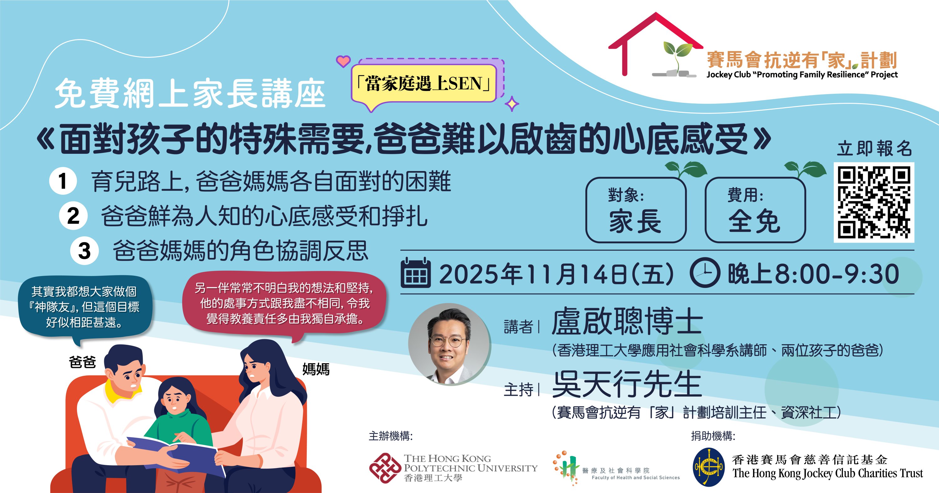 【免費網上家長講座】家庭遇上SEN系列《面對孩子的特殊需要,爸爸難以啟齒的心底感受》